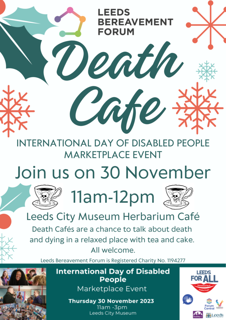 *Our last Death Cafe of 2023 will be a special event held as part of International Day of Disabled People Marketplace at Leeds City Museum on Thursday 30 November. We hope as many disabled people as possible will feel able to join us at this Death Cafe – the event is open to all.